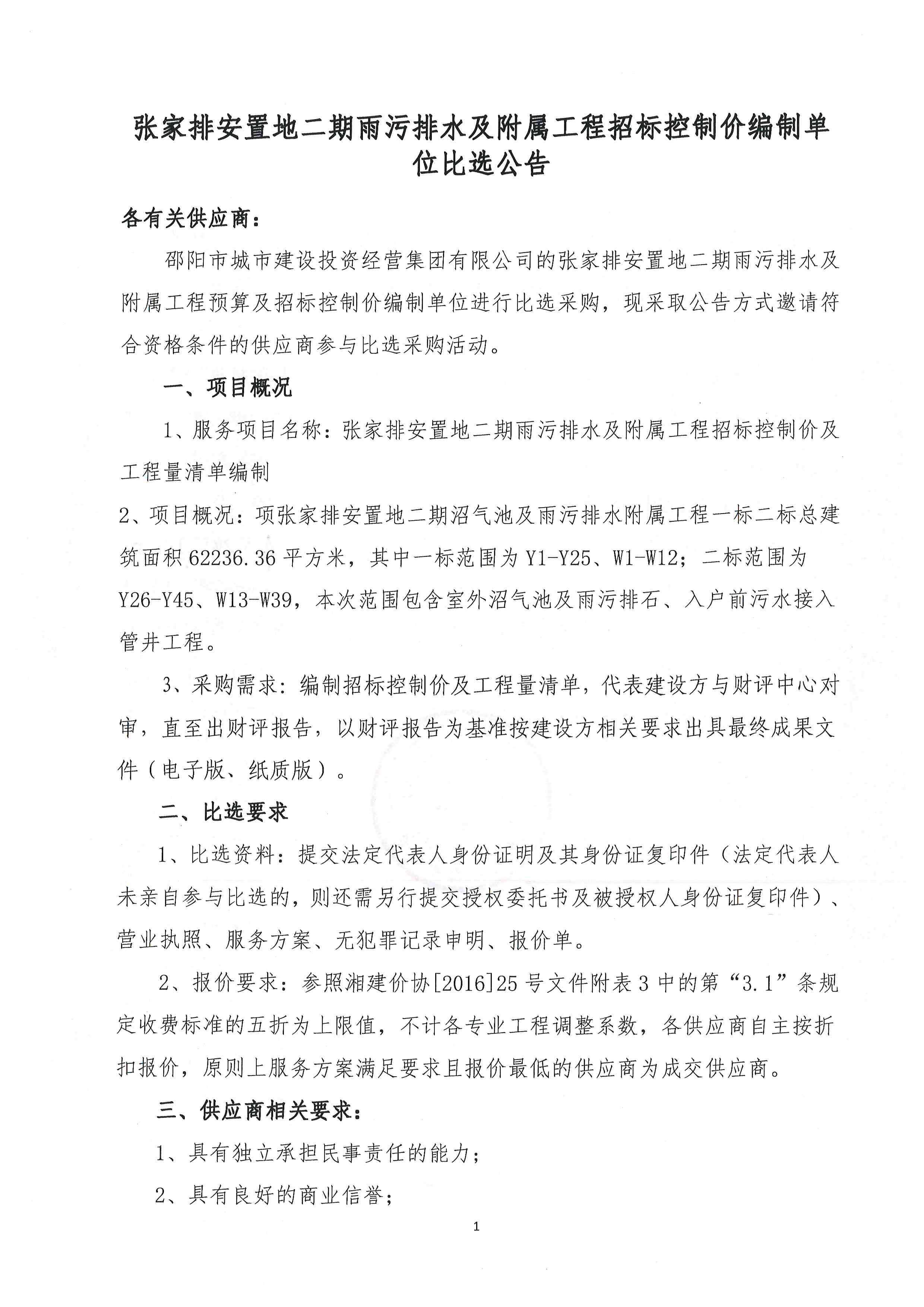 张家排安置地二期雨污排水及附属工程招标控制价编制单位比选公告