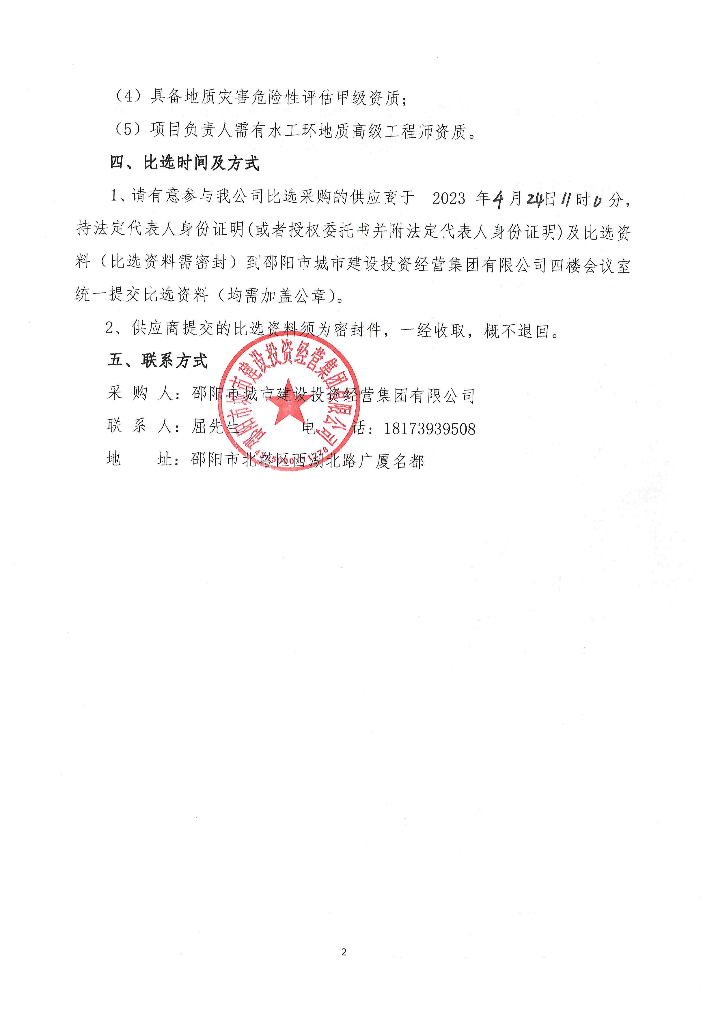 邵阳市城市建设投资经营集团有限公司2023年短期融资债券发行承销服务主承销商选聘采购项目结果公示..