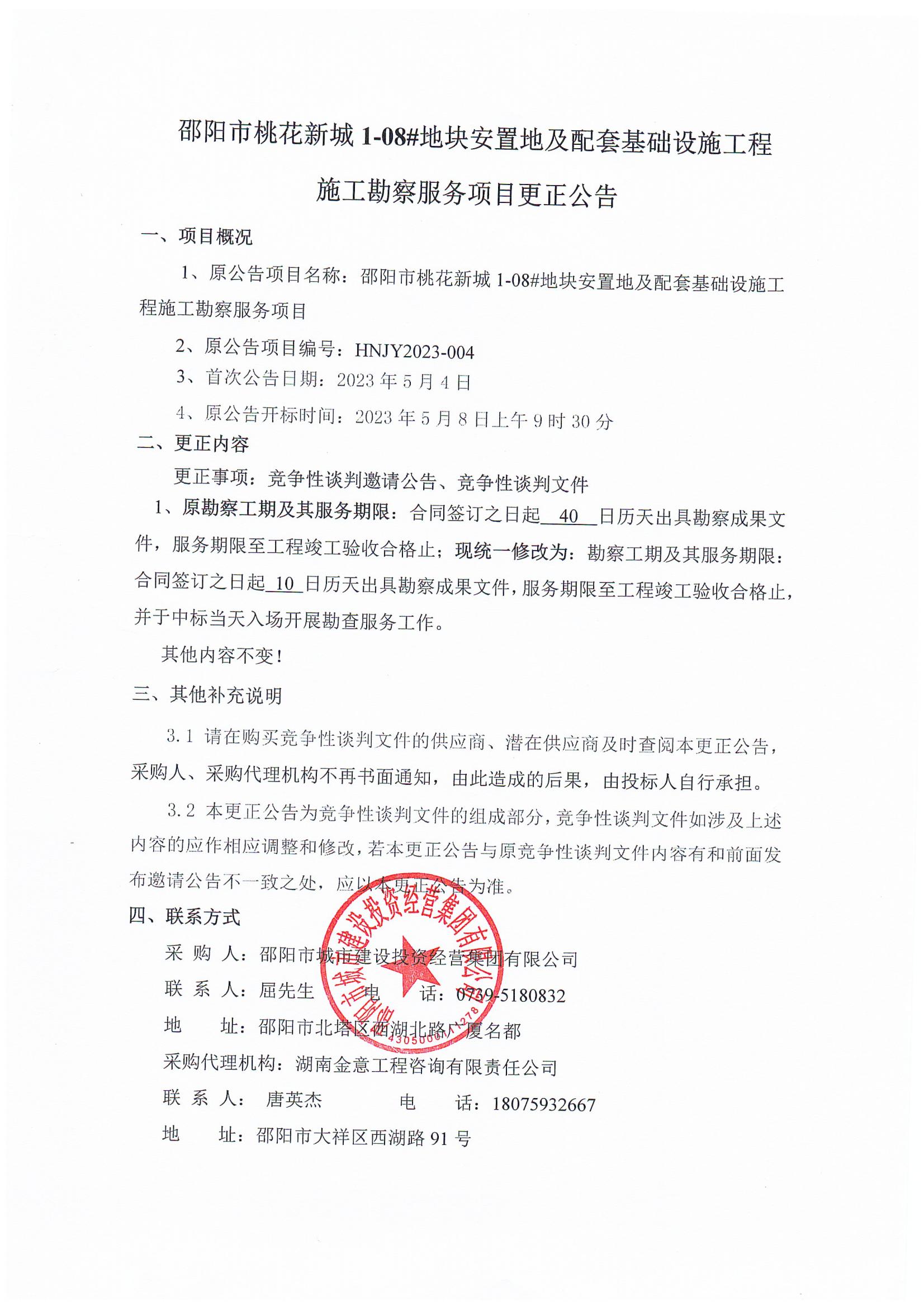 邵阳市桃花新城 1-08#地块安置地及配套基础设施工程施工勘察服务项目谈判采购成交公告..