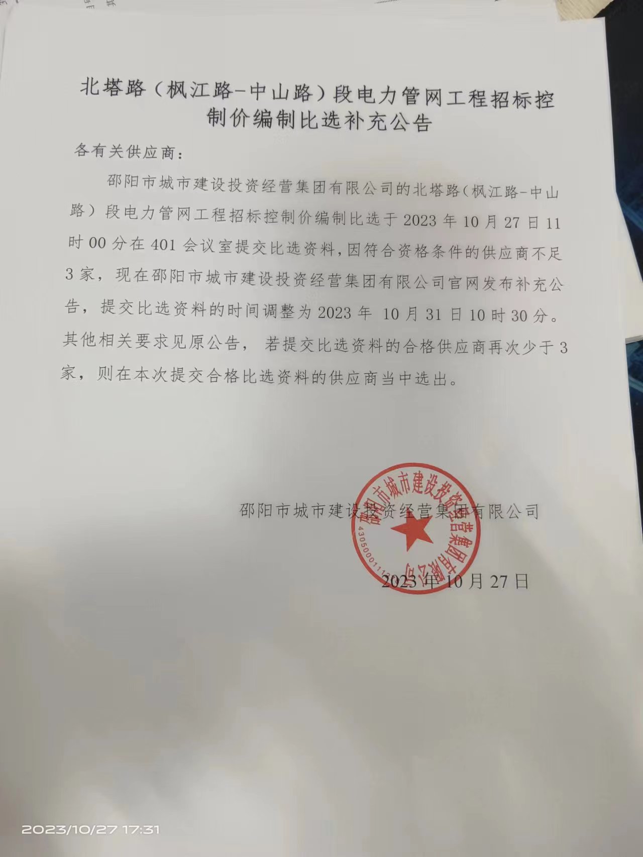 北塔路(枫江路-中山路)段电力管网工程招标控制价编制比选补充公告