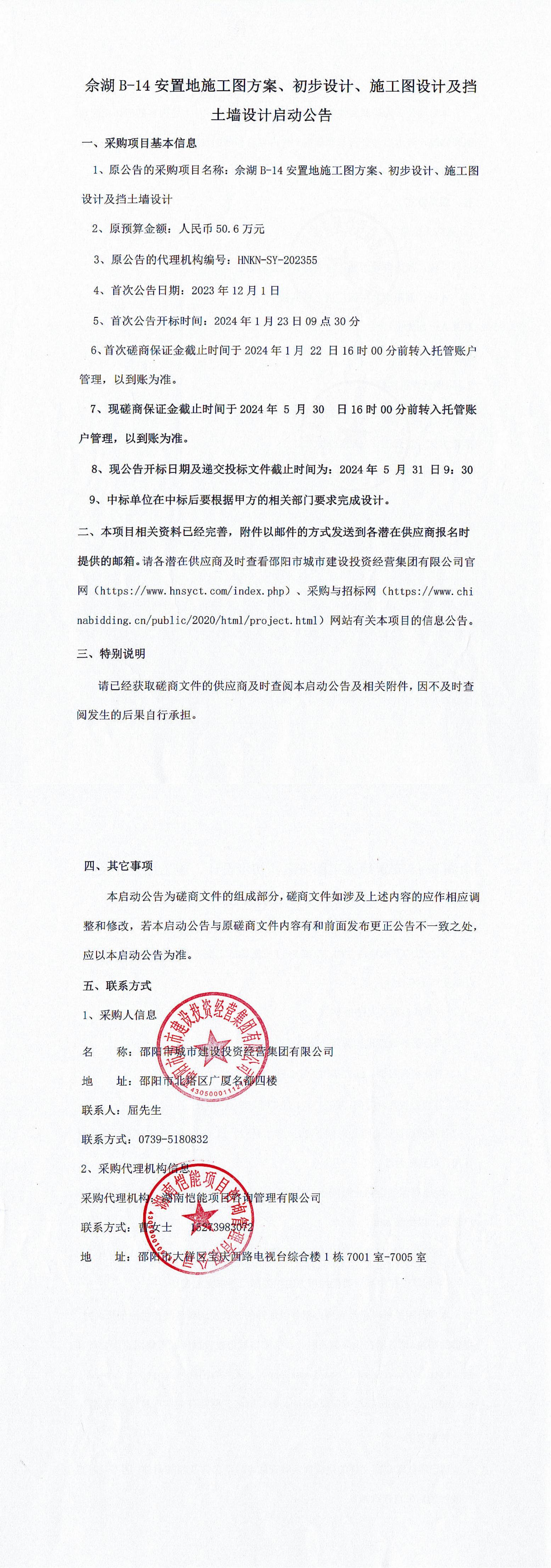 佘湖B-14施工图方案、初步设计、施工图设计及挡土墙设计启动公告