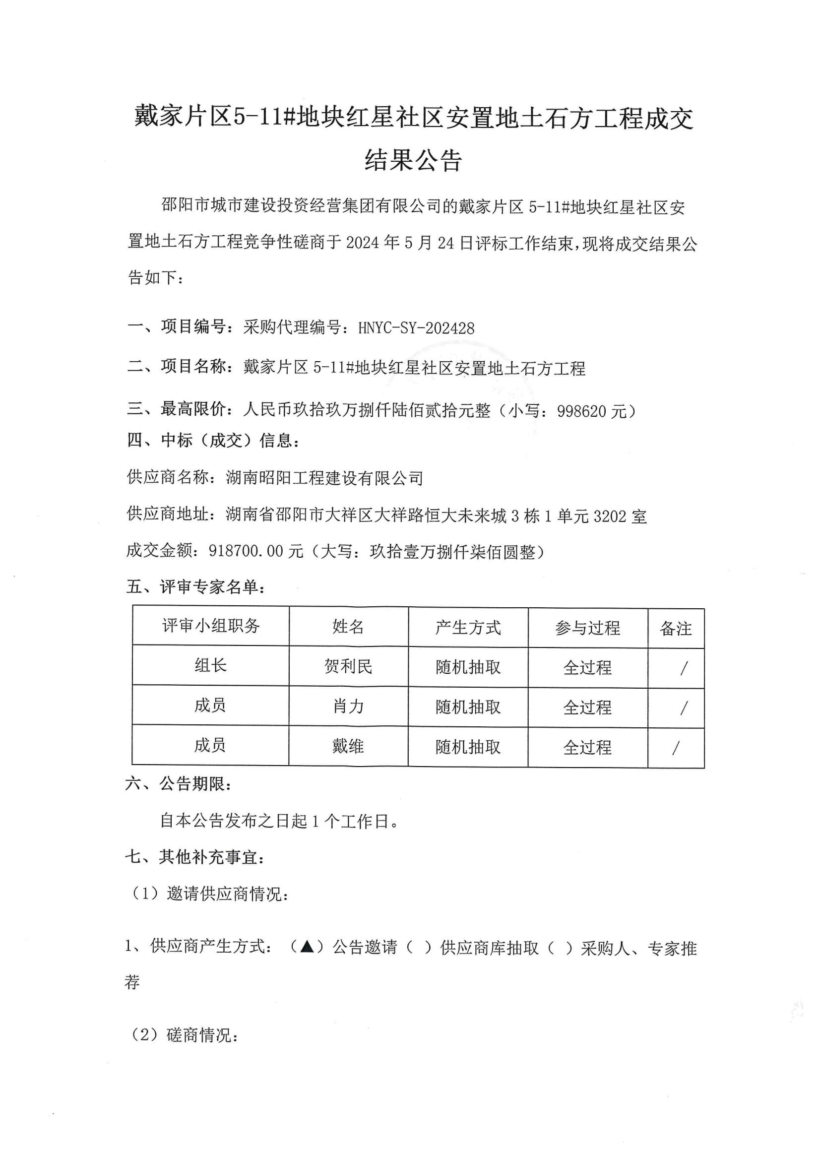 戴家片区5-11#地块红星社区安置地土石方工程成交结果公告