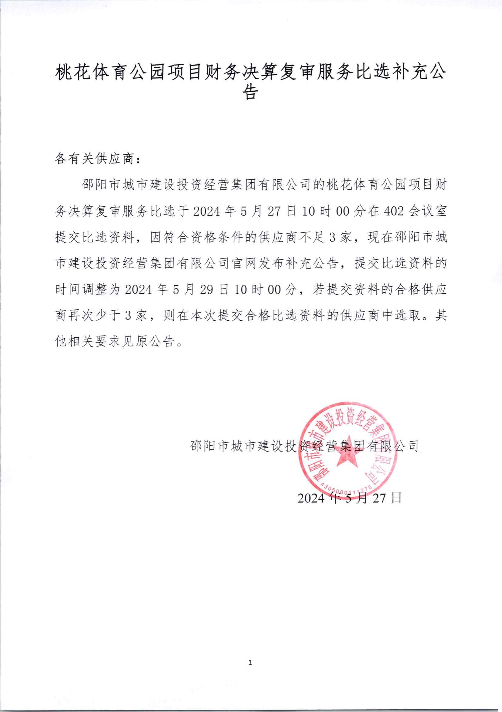 桃花体育片区公司体育公园项目财务决算审计选聘补充公告