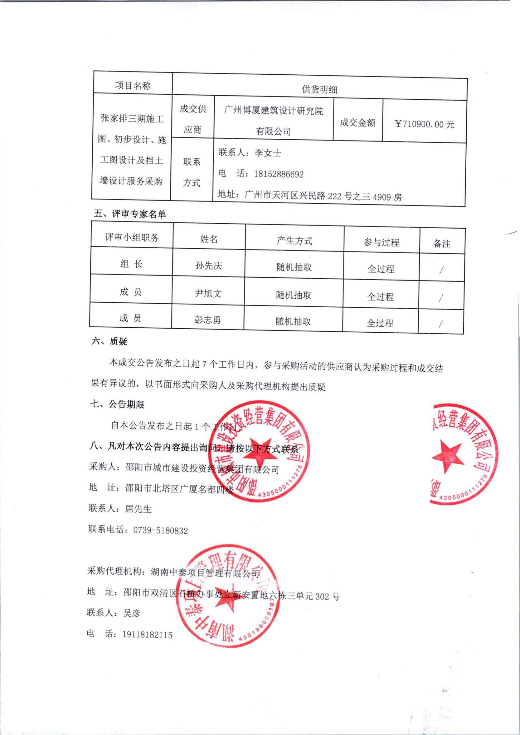 张家排三期施工图、初步设计、施工图设计及挡土墙设计成交公告