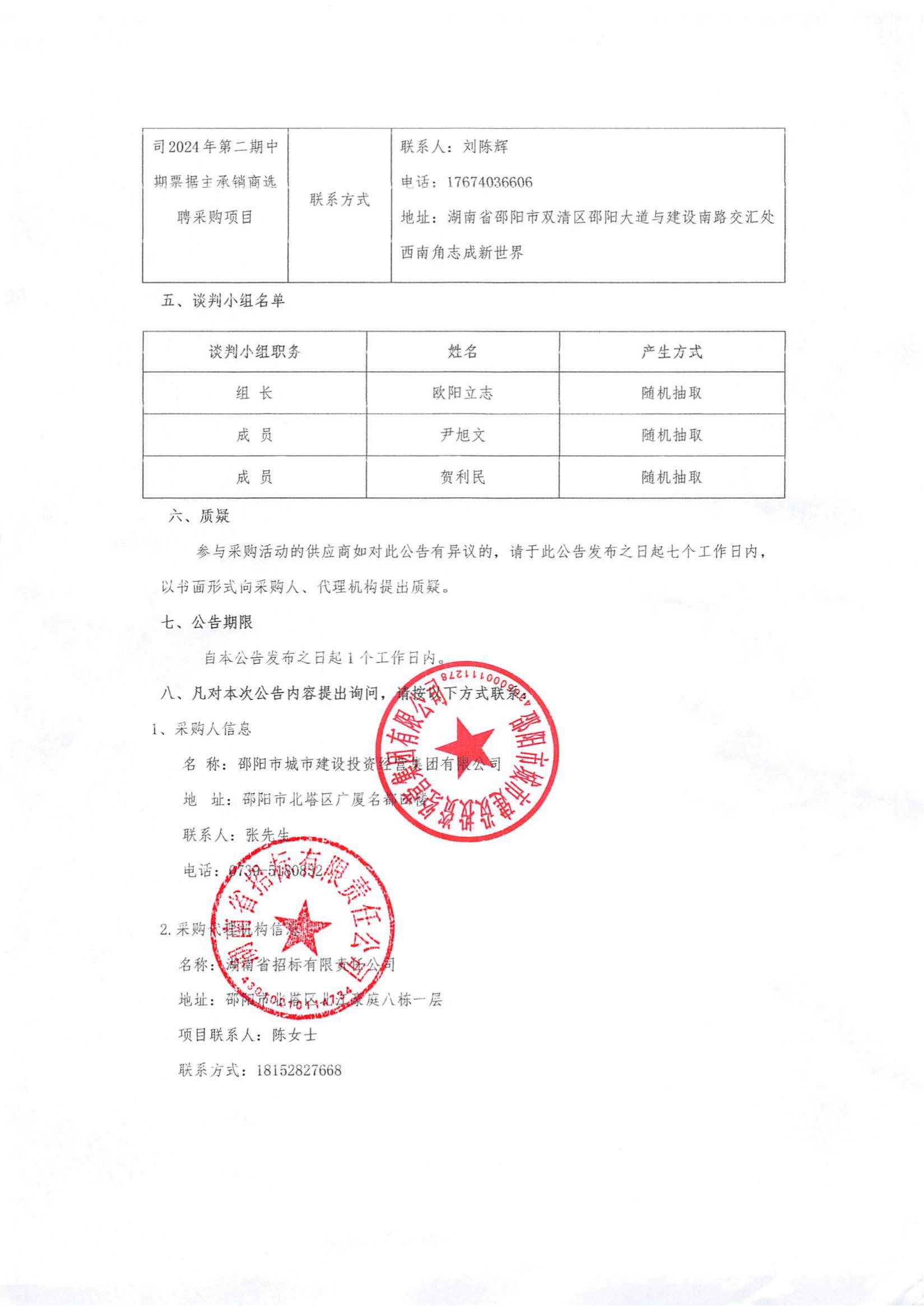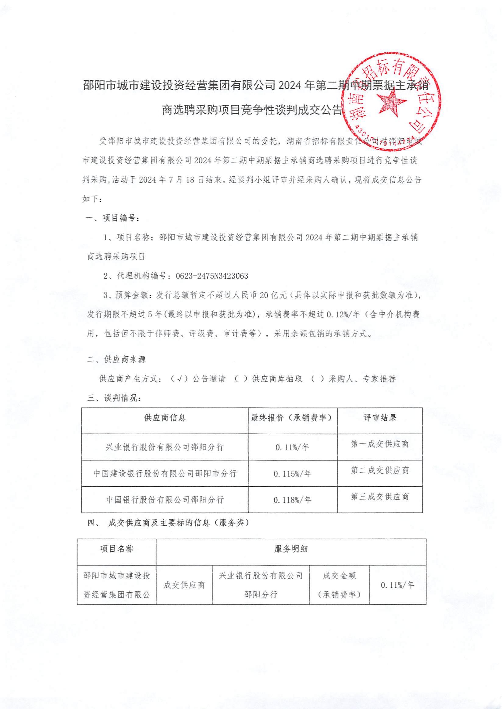 邵阳市城市建设投资经营集团有限公司2024年第二期中期票据主承销商选聘采购项目竞争性谈判成交公告