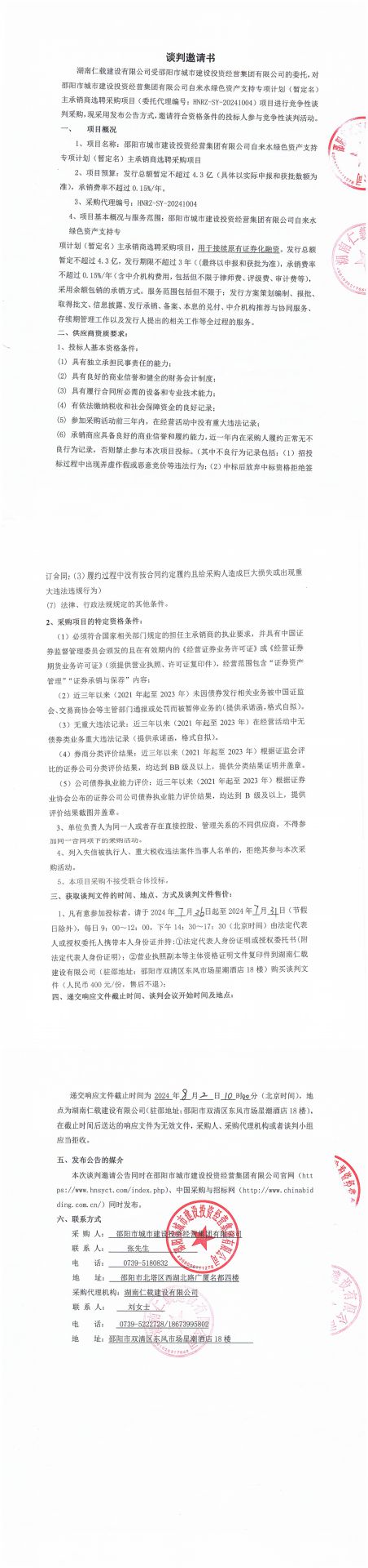 邵阳市城市建设投资经营集团有限公司自来水绿色资产支持专项计划(暂定名)主承销商选聘采购项目谈判邀请书
