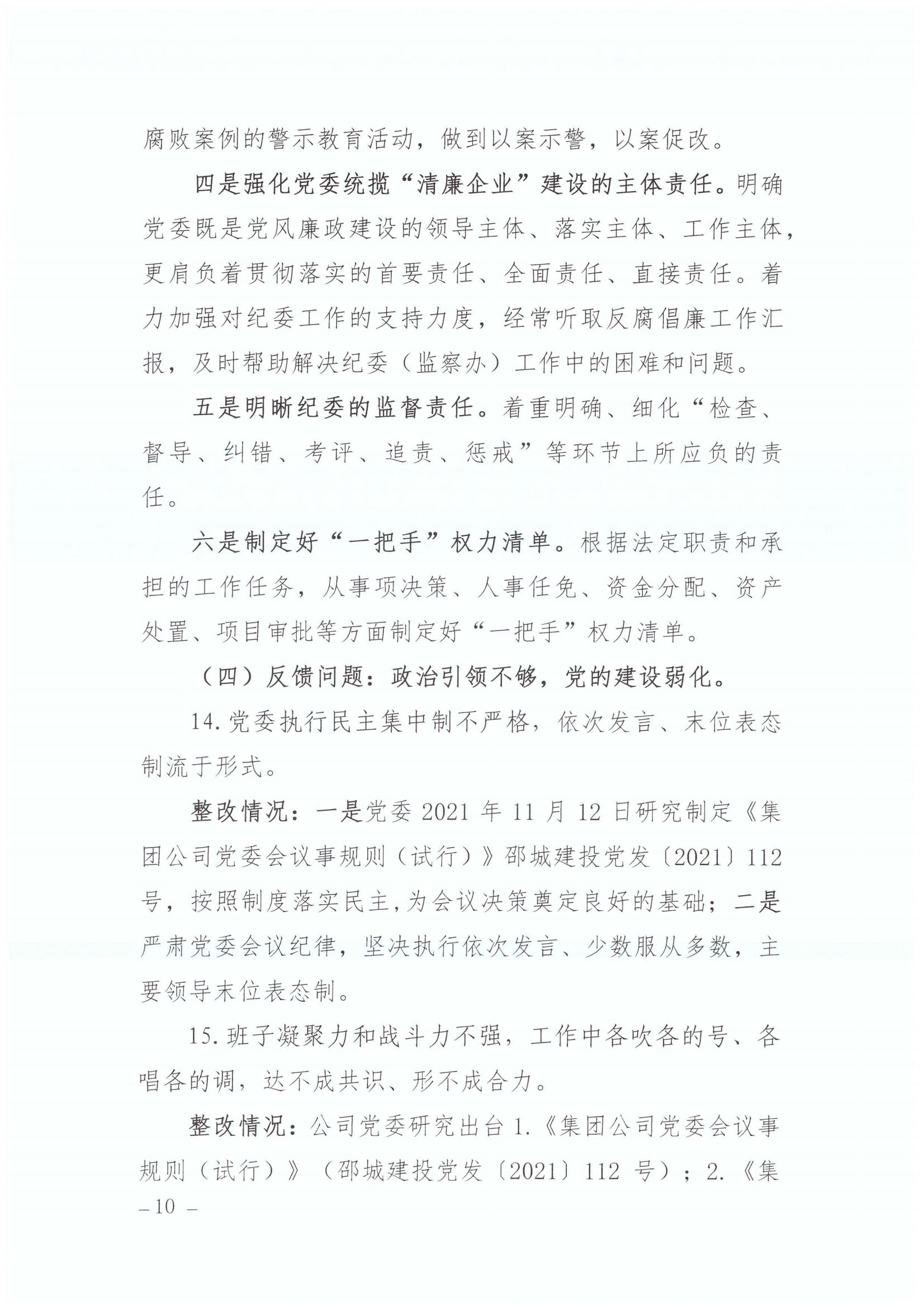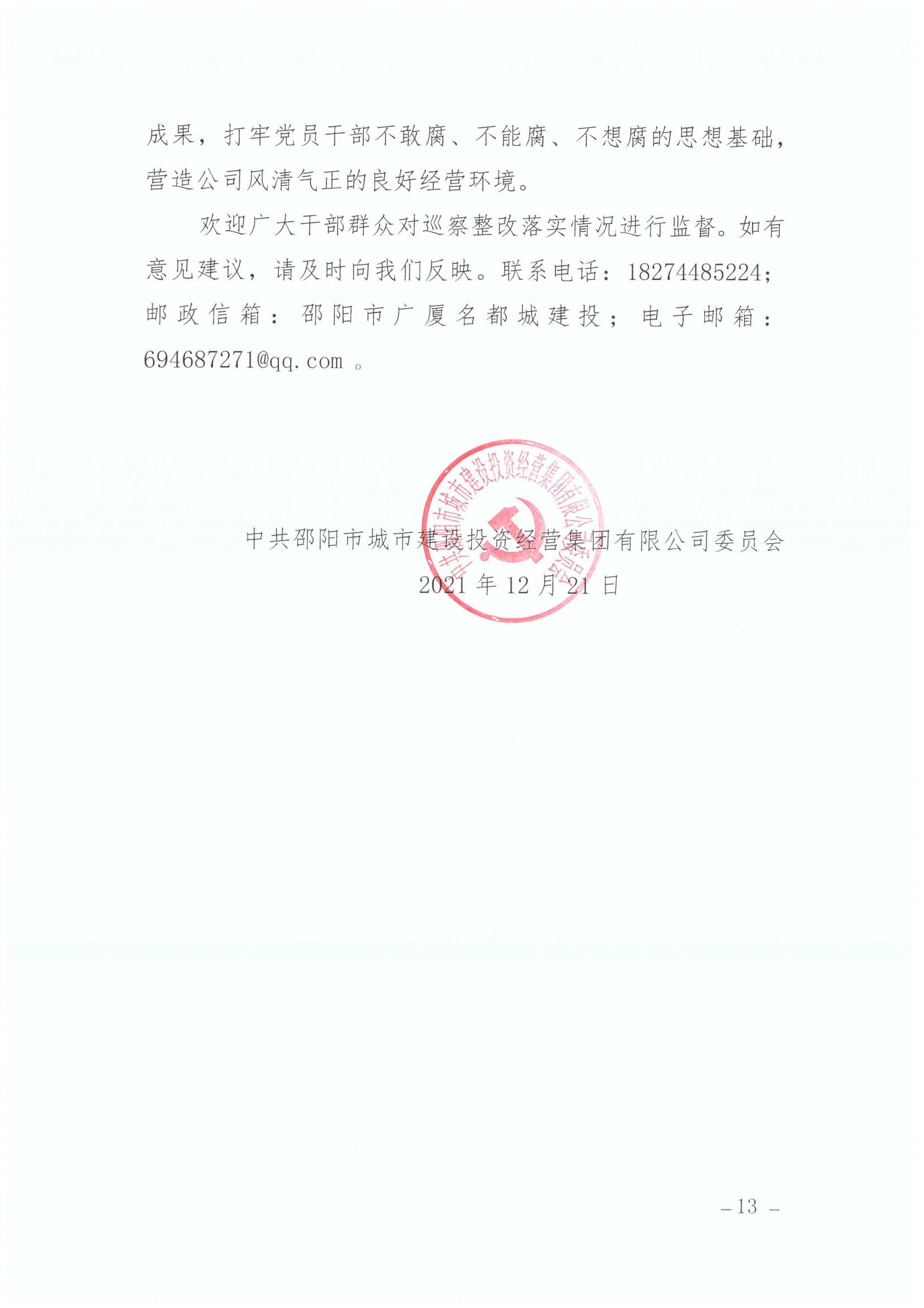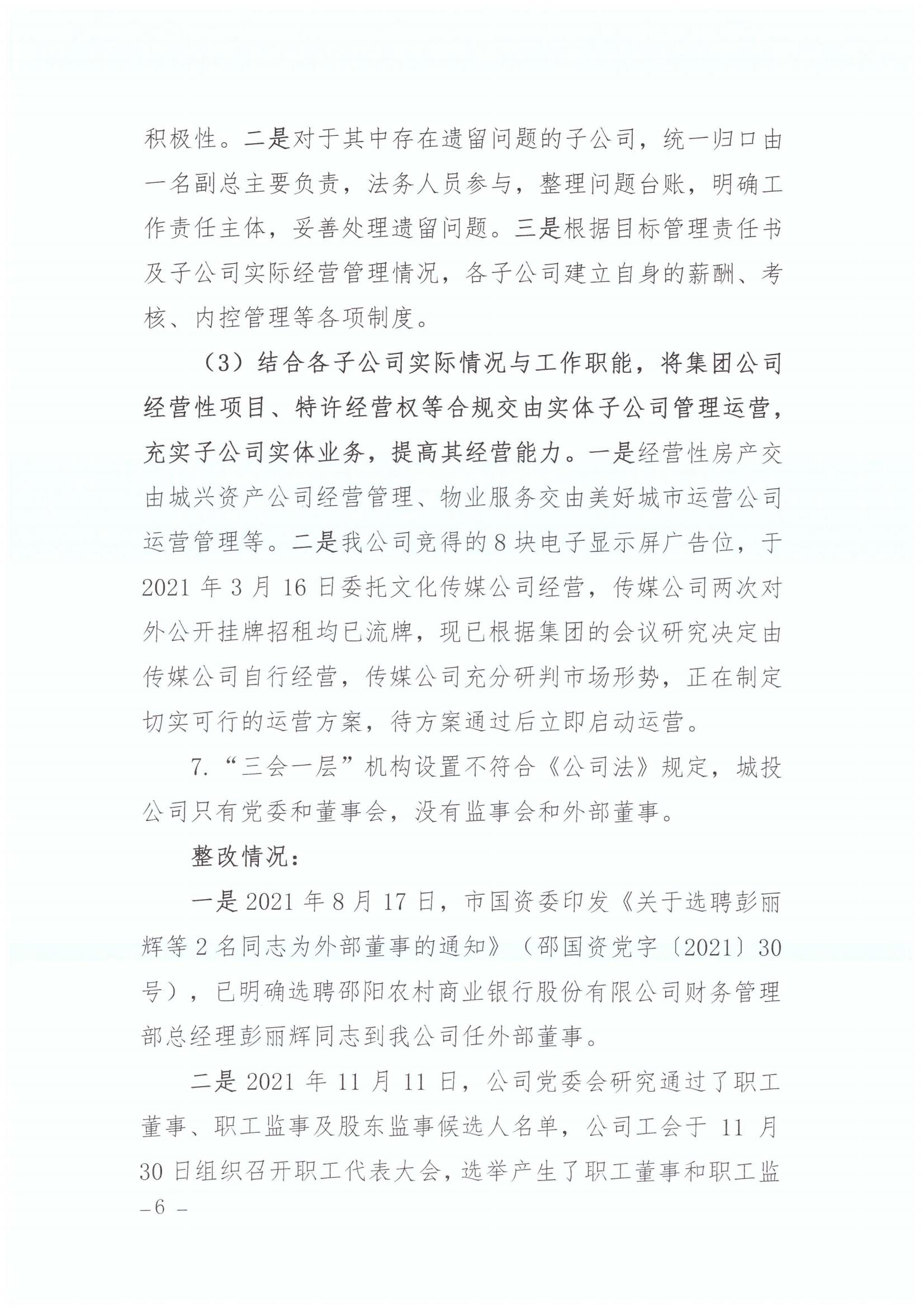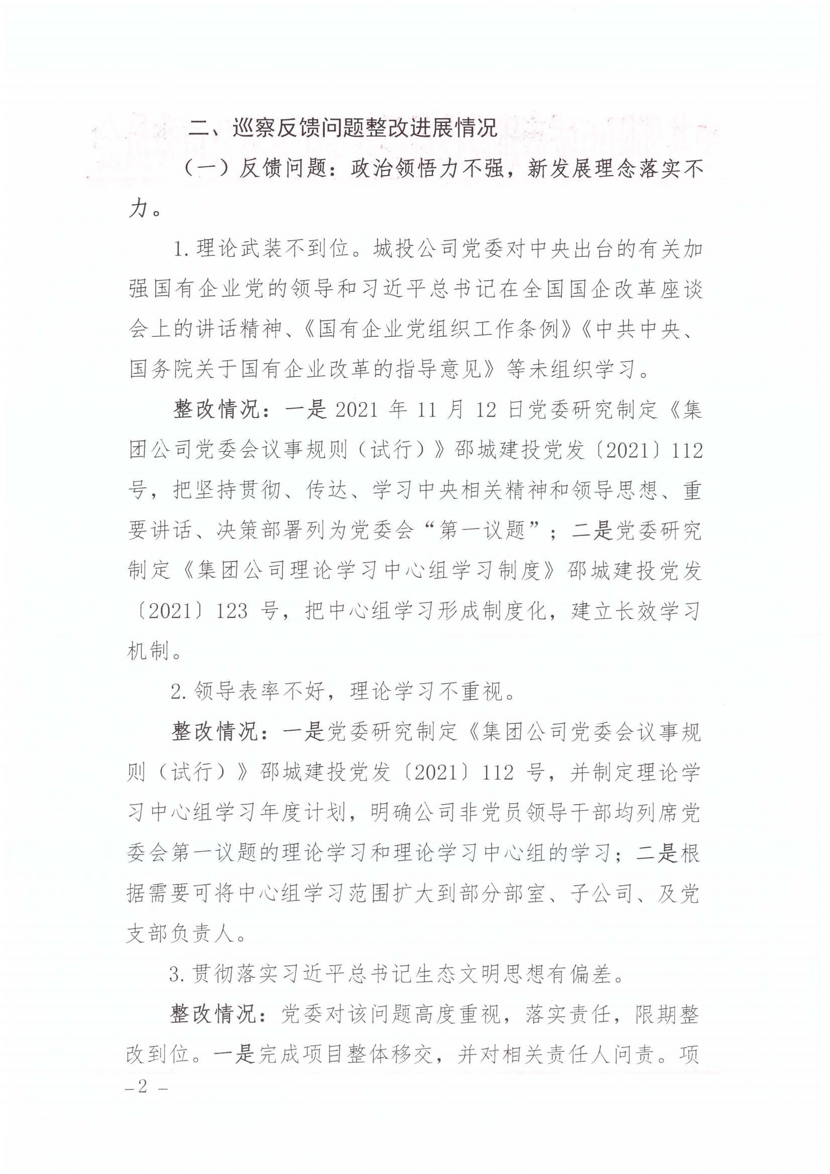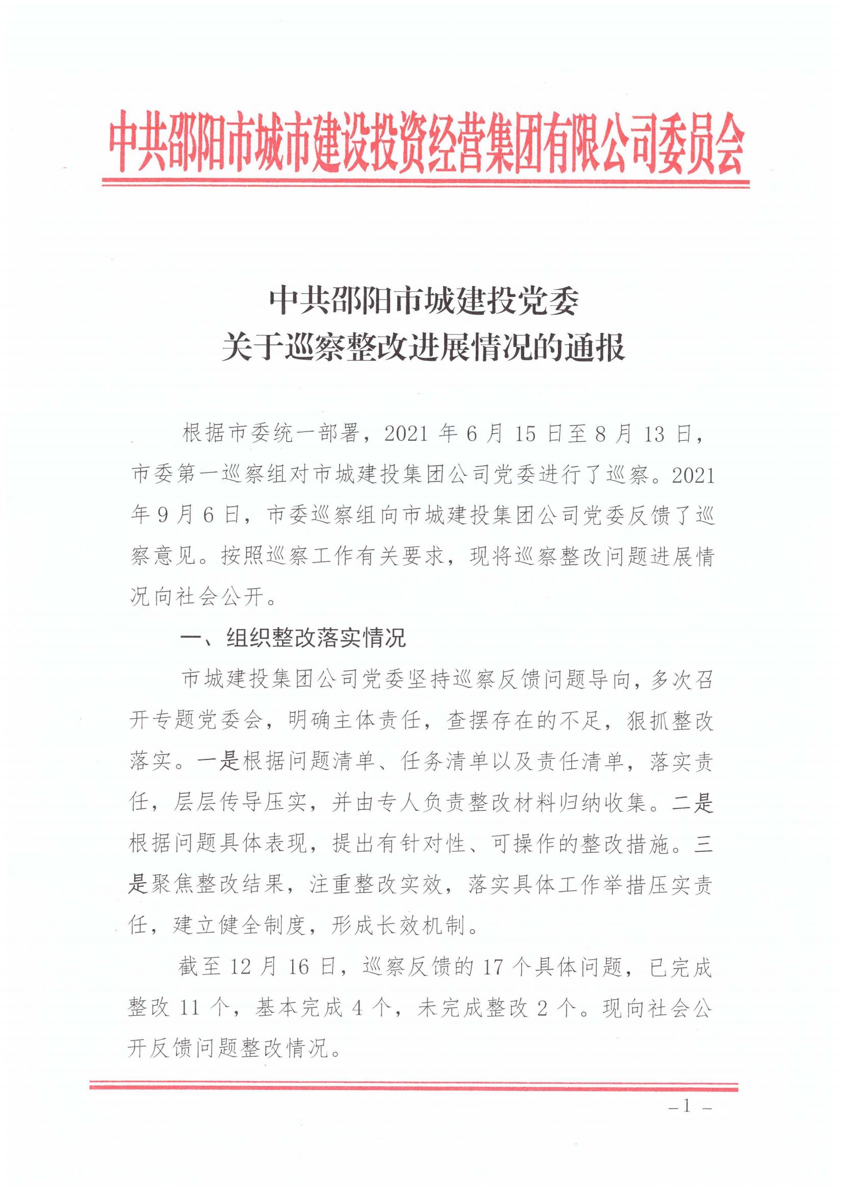 中共邵阳市城建投党委关于巡察整改进展情况的通报