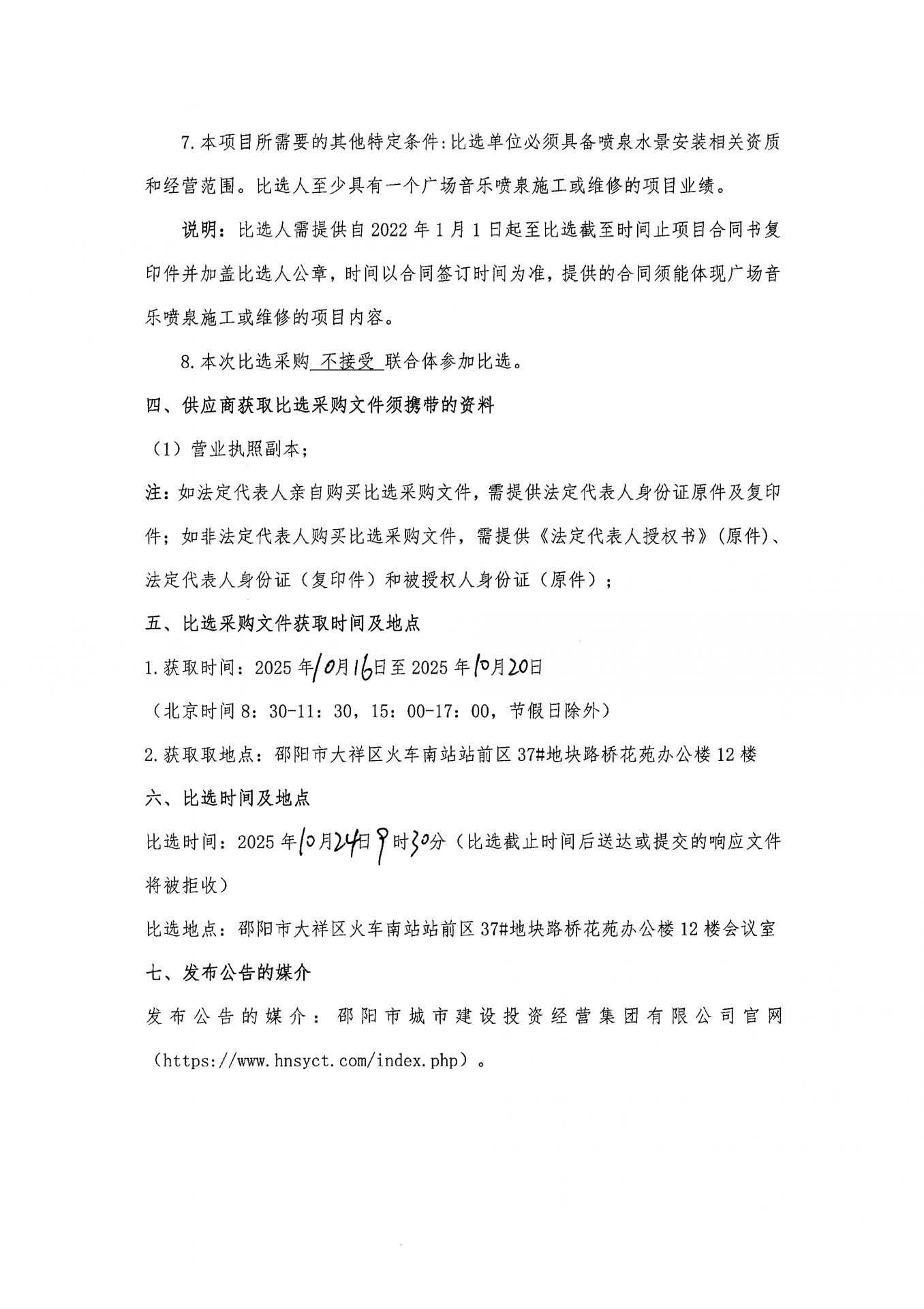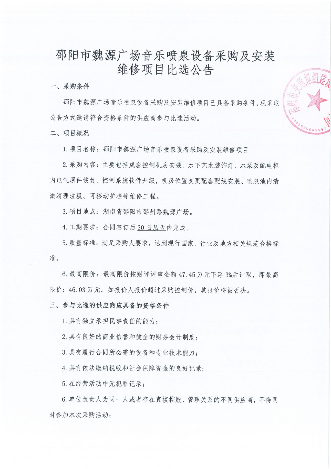 邵阳市魏源广场音乐喷泉设备采购及安装维修项目比选公告..
