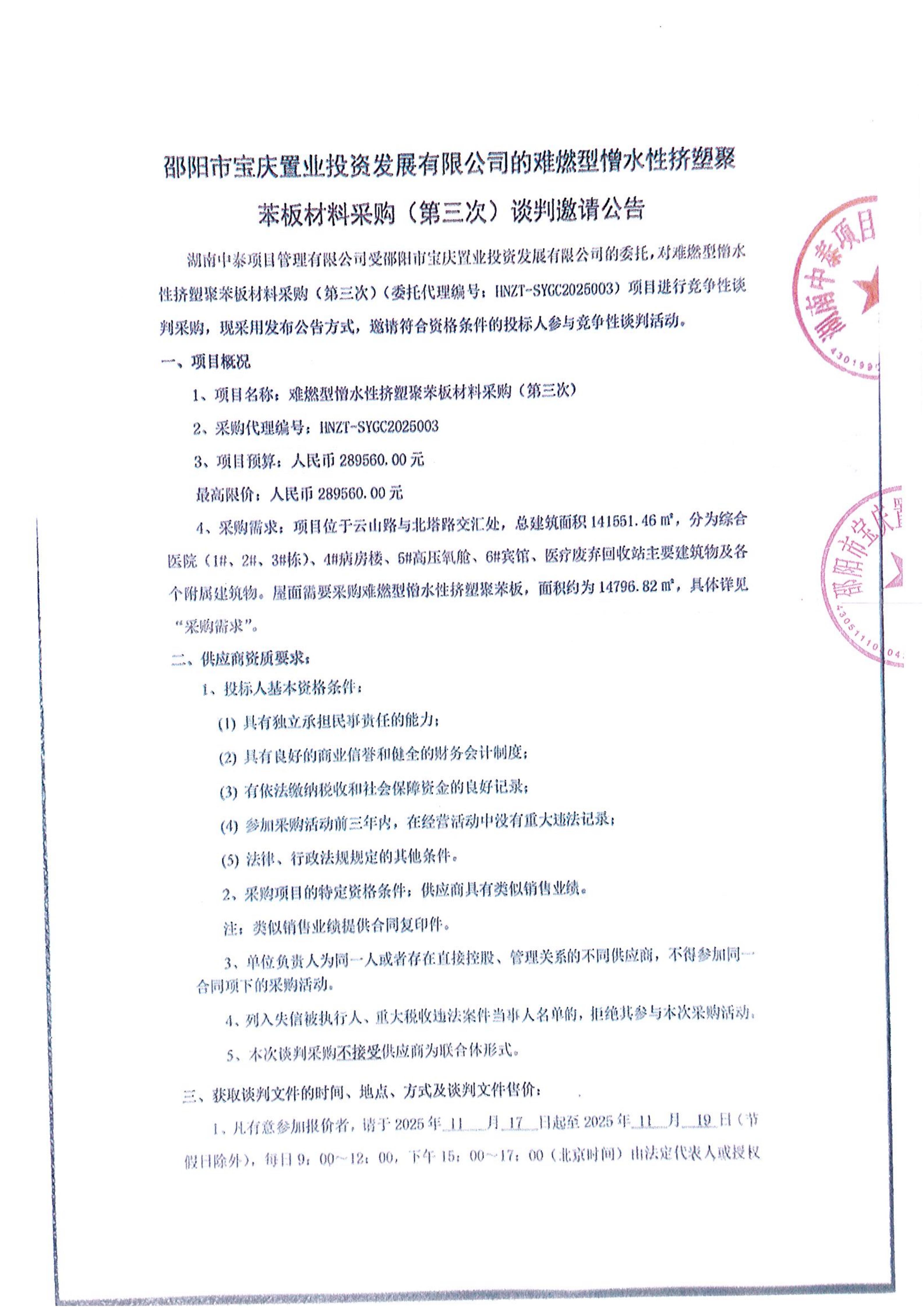 难燃型憎水性挤塑聚苯板材料采购谈判邀请公告(第三次)..